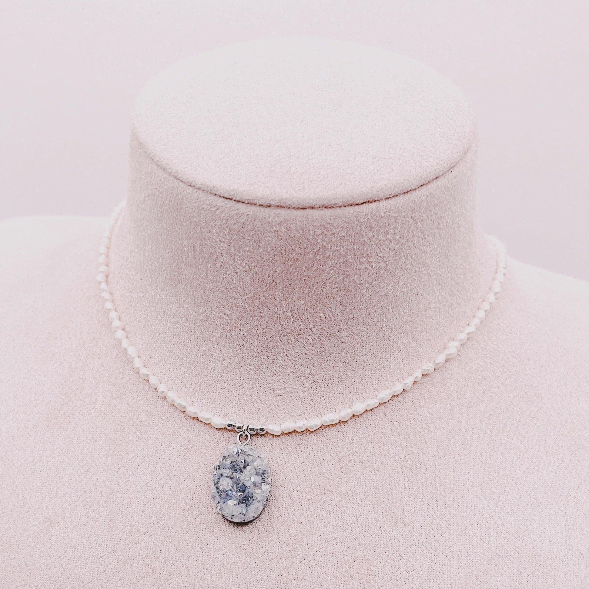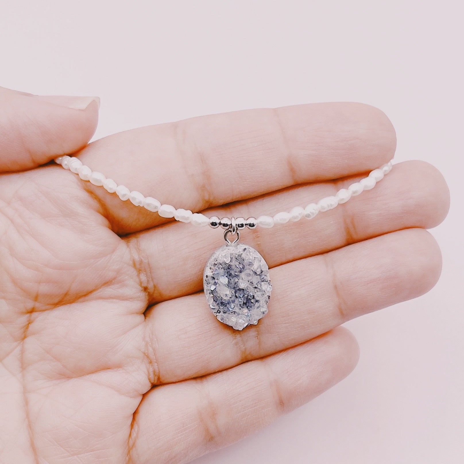 Collar ajustable base perlas río pequeñas con drusa amatista aura y detalles plata 925.