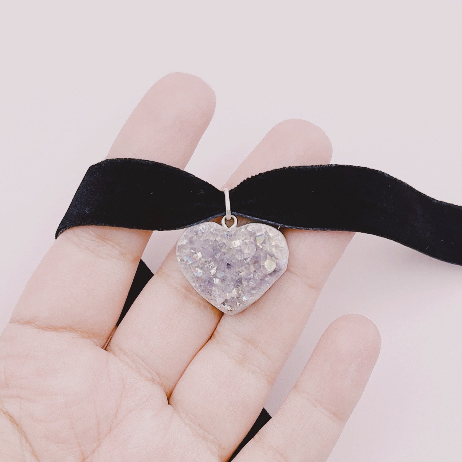 Collar tipo gargantilla de terciopelo negro con corazón drusa amatista aura.