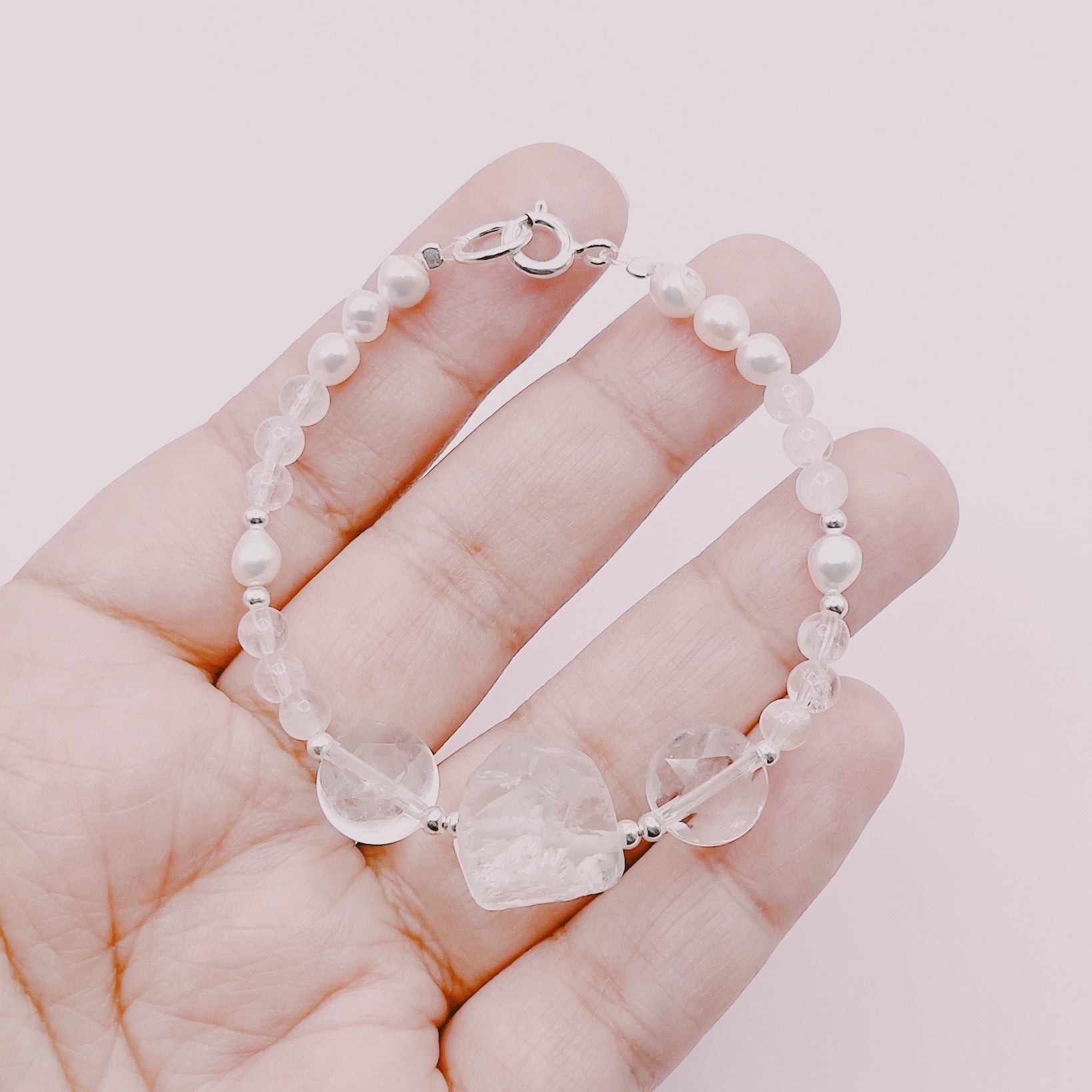 Pulsera con cuarzos cristales rústico, faceteados y lisos, perlas río premium.